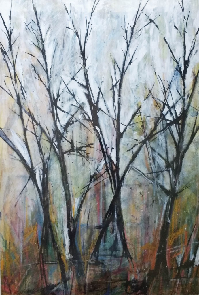 I originally started painting in mixed media when I created a number of paintings based on the trees in Thwaite Hall Gardens / Grounds in Cottingham before I went to College full time to study art. I always used to walk around the less manicured parts of the grounds to take photographs and sketch and below are two of the original paintings that certainly influenced my later illustration work, such as the mixed media gravestone Illustrations. When I say mixed media – I used almost anything back then on my mixed media art without worrying about how long it would last or how to fix and protect it. In these pieces I used acrylics, black ink, chalk pastels, charcoal, oil pastels and make-up (lip stick and eye shadow) in lovely colours that were perfect for the autumn / winter dead foliage and general woodland. They have survived quite well considering how they were created and what medium was used.