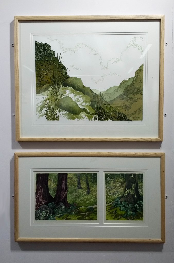 Top: Early Morning, Hillside by Laura Boswell. Combined lino and woodblock.