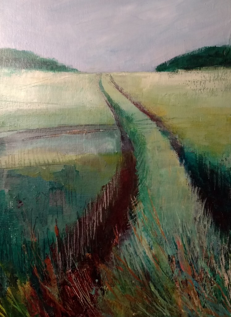 I start off all acrylic paintings with an underpainting (the initial layer of paint applied to the surface), to get rid of the stark white of the canvas or canvas paper and to form a base layer as a foundation for the rest of the painting. Depending on the subject matter, I will also start to block-in basic tones and shapes, and almost draw in the composition with a brush at the underpainting stage too. As the paint used is thin it drips, it splashes and overall it is not pretty to look at… but there’s no need at this stage for it to be pretty! An underpainting is intended to be painted over and not seen in the final painting, however, many painters will let parts of an underpainting show through, which can be very effective if you use a contrasting hue for your underpainting – a colour that contrasts with the dominant colour of the scene. For example, using a burnt sienna for the underpainting of a painting that is going to be predominantly green. I have used harmonising and contrasting monochromatic underpainting, depending on the effect I’m trying to achieve, but I don’t have one colour I always use, which some painters do. I’ll often decide on the colour I will use when I start. The darkest underpainting colour I’ve used is a mix of blue and brown (to achieve a warm grey) but I’ve never tried painting a landscape over a solid layer of black, so I thought I’d give it a try with a piece of canvas paper that I had previously painted black (for a reason I can’t really remember). I chose a view over some fields in Cambridgeshire, near Ely, on canvas paper.