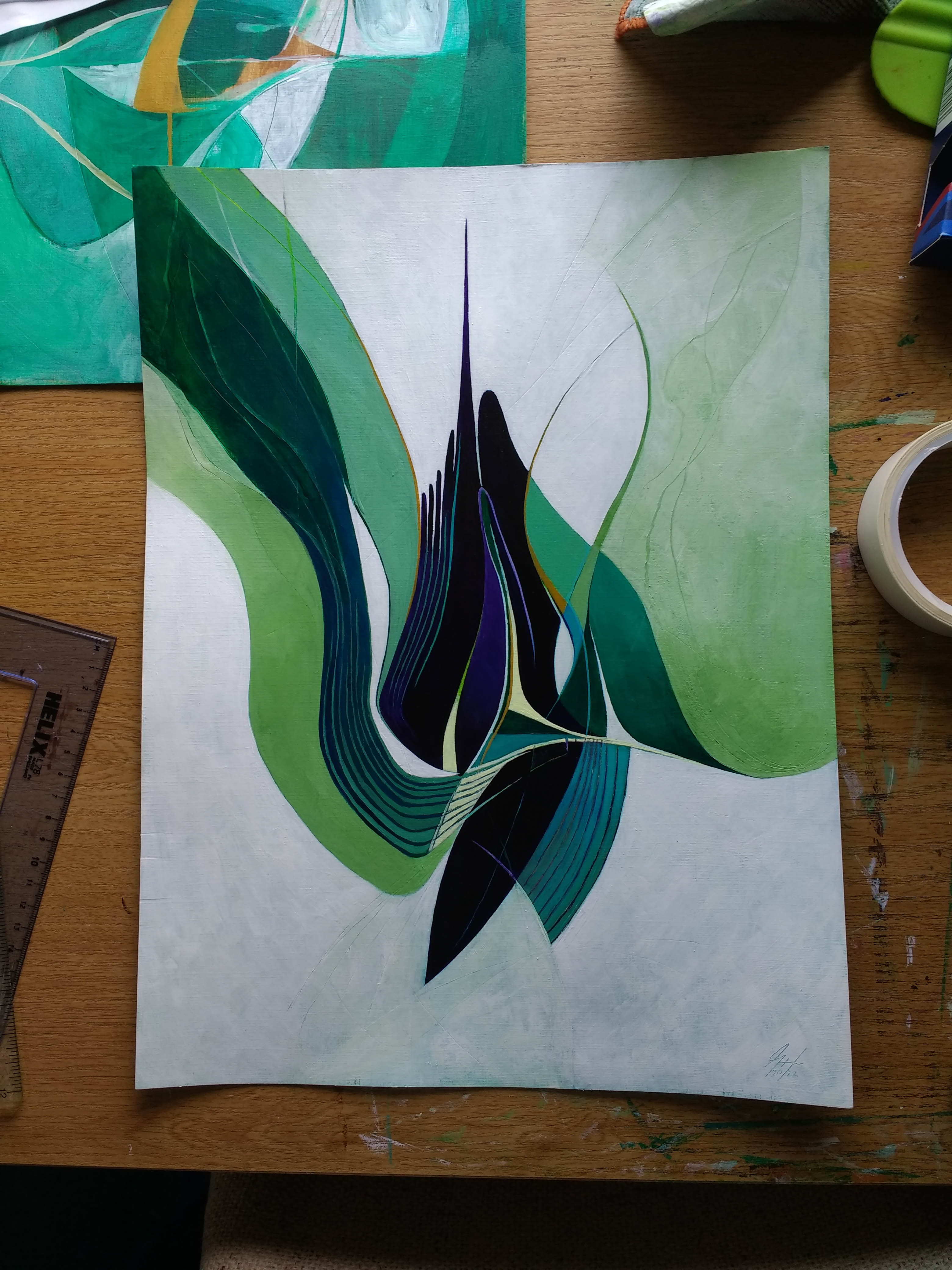 From a collage sat on my work table, that I had created and drawn over for the past few months, I roughly drew out the design onto canvas paper. I had an idea of the main colours that I wanted to use (dark purple and greens) and then off I went.