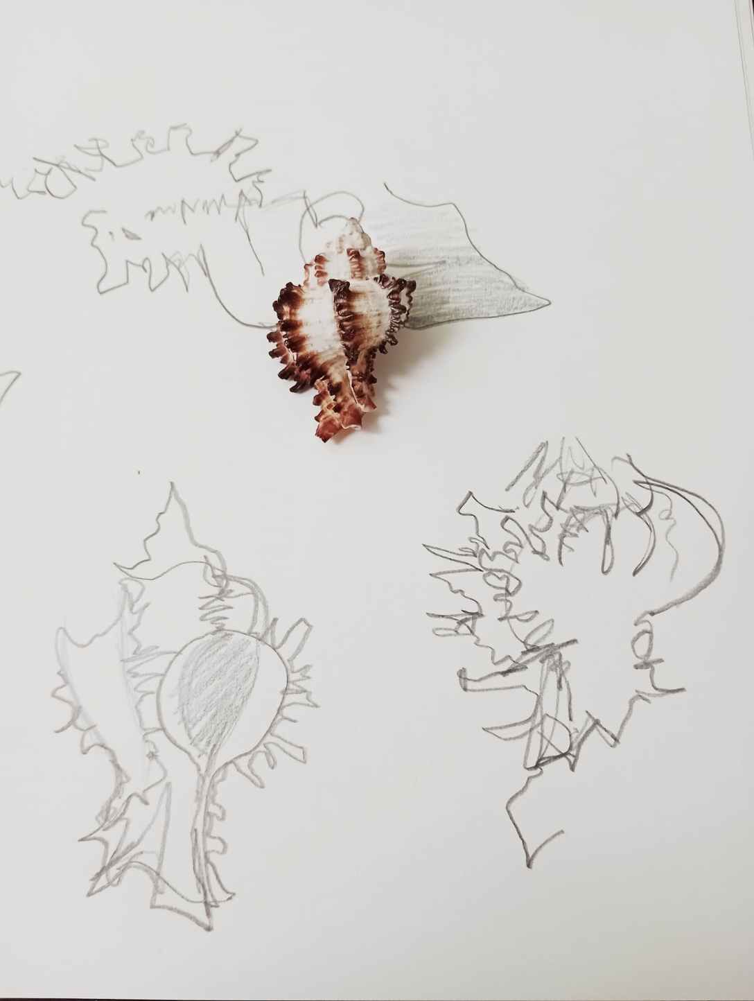 I started a project inspired by the early cabinets of curiosities / wonder rooms using shells that I had collected and drawing by touch, blind contour drawings, etc... techniques...