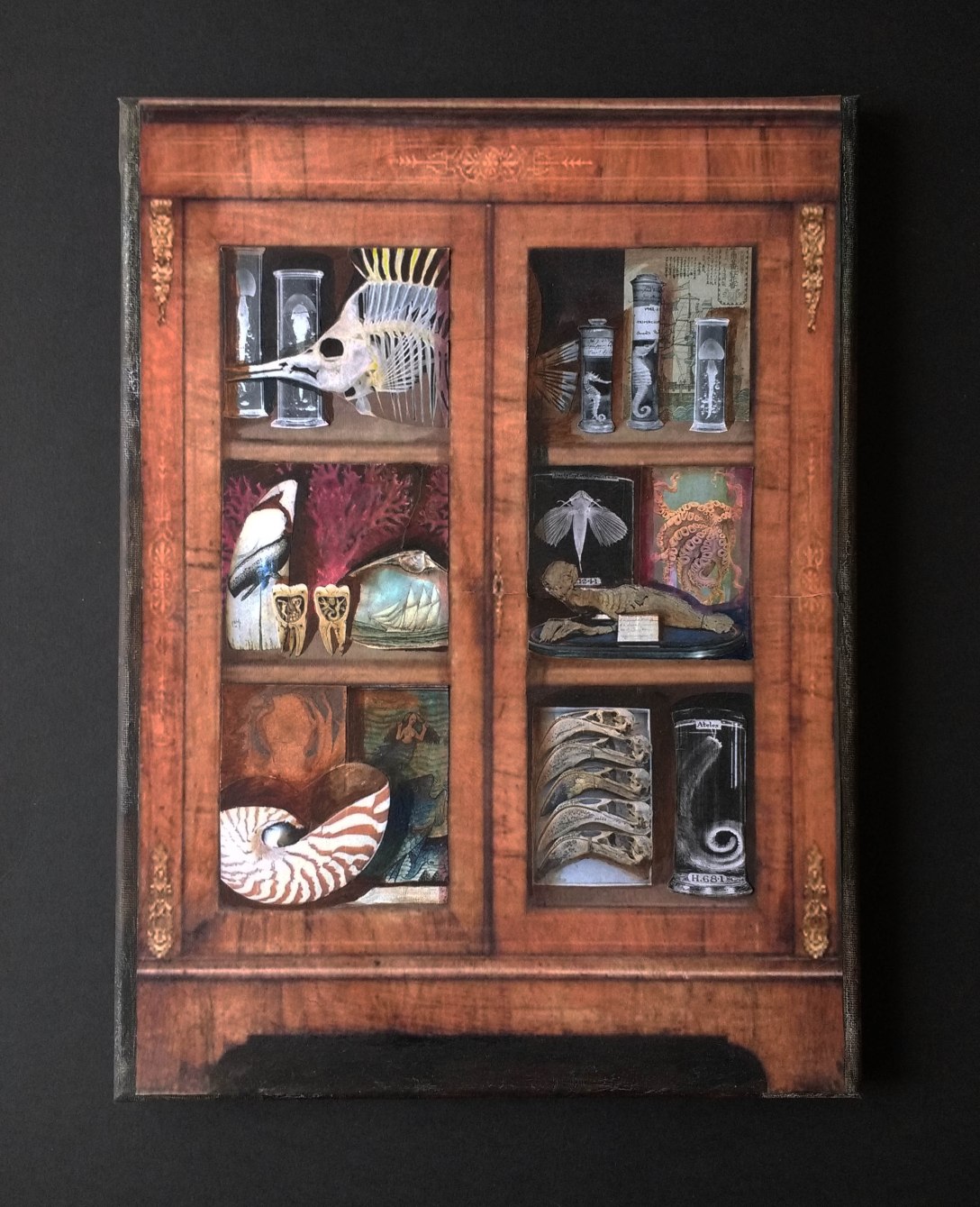 One day, while I was painting something completely different, I decided to create my own cabinet of curiosities using printed collage pieces of rare, unusual and intriguing objects I had collected on Pinterest